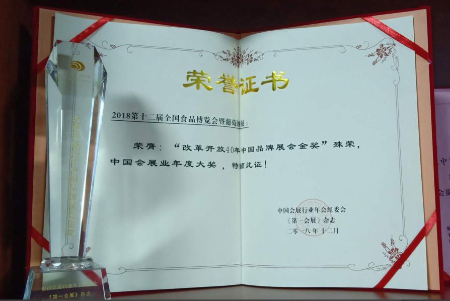 中貿科技集團有限公司(以下簡稱中貿集團)主辦的“全國食品博覽會暨葡萄酒展”榮膺“改革開放40年中國品牌展會金獎”的殊榮!