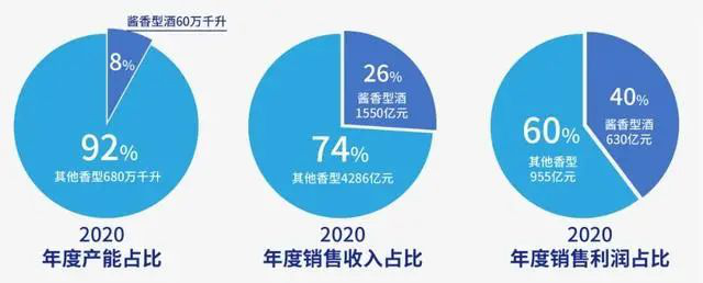 據(jù)有關(guān)數(shù)據(jù)統(tǒng)計(jì)顯示,2020年1-12月,中國(guó)醬香酒產(chǎn)業(yè)實(shí)現(xiàn)產(chǎn)能約60萬(wàn)千升,同比增長(zhǎng)約9%,約占中國(guó)白酒行業(yè)產(chǎn)能740萬(wàn)千升的8%;實(shí)現(xiàn)行業(yè)銷售收入約1550億元,同比增長(zhǎng)14%,約占中國(guó)白酒行業(yè)銷售5836億元的26%;實(shí)現(xiàn)行業(yè)銷售利潤(rùn)約630億元,同比增長(zhǎng)約14.5%,約占中國(guó)白酒行業(yè)利潤(rùn)1585億元的39.7%。